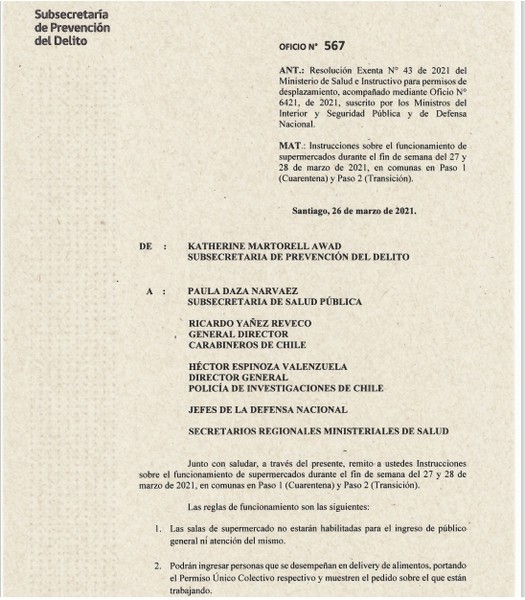Estimados socios les compartimos, instrucciones sobre el funcionamiento de supermercado durante el fin de semana del 27 y 28 de marzo de 2021, en comunas en Paso 1 (cuarentena) y Paso 2 (Transición).
